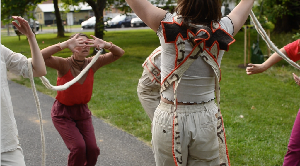 The installation and participatory events reflect an ongoing process of embodied research and ritual alongside “Loth” Spring and the South River. Our processes incorporate dance, fiber arts, sound, and other modalities. The collected images, writing, video fragments, found ephemera, textiles, ritual craft objects, and guided workshops engage with a set of questions around disturbance ecology, animate landscapes, non-linear mythology, and shifting patterns of relationships.