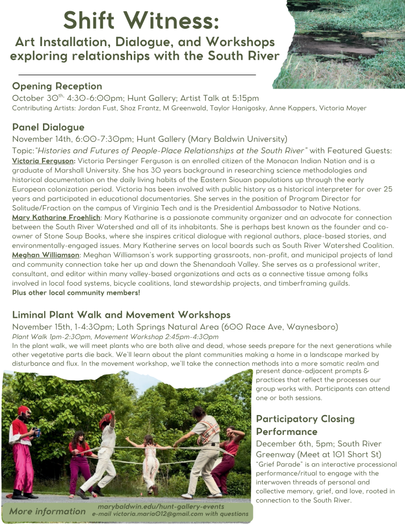 Shift Witness is a collaborative installation created and coordinated by Jordan Fust, Shoz Frantz, M Greenwald, Taylor Hanigosky, Anne Hopestill Kappers, and Victoria Moyer. There are a variety of events that accompany the show both in the gallery space and at the South River in Waynesboro, VA.
