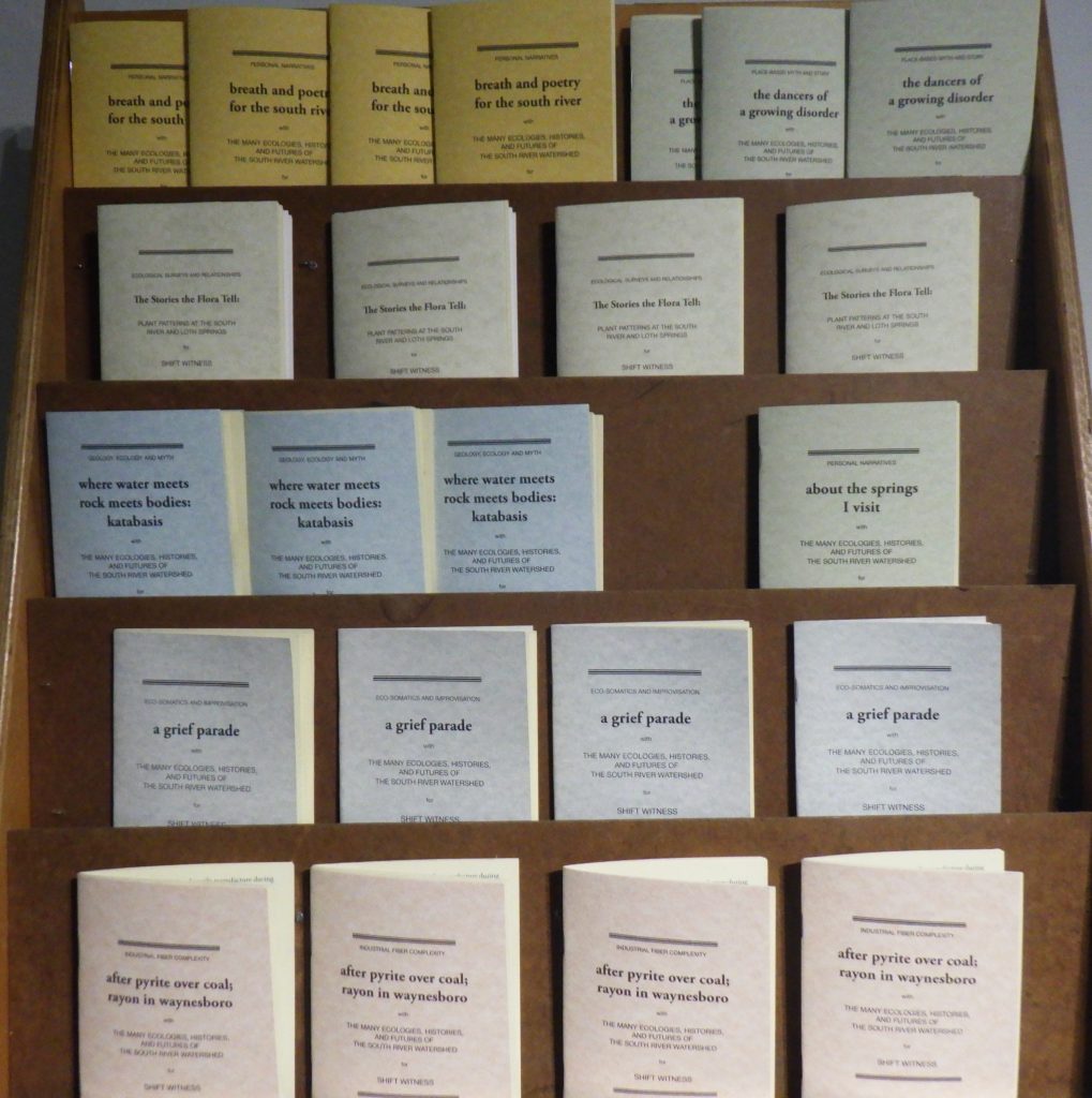 there is no easy way to sum up the complicated history of the South River, the spring-fed tributaries, and the shifting assemblages of inhabitants and participants, but we can say that our intention is to honor the complexity of interwoven stories and to promote a spirit of reverent, respectful, even devotional relationship with the river, springs, and land. We have been called to work with this place, but all places are alive and sacred in their own way. Like dormant seeds, we seek to open cracks in the concrete slabs of extractive modes that we’ve been raised in when it comes to relating to place.