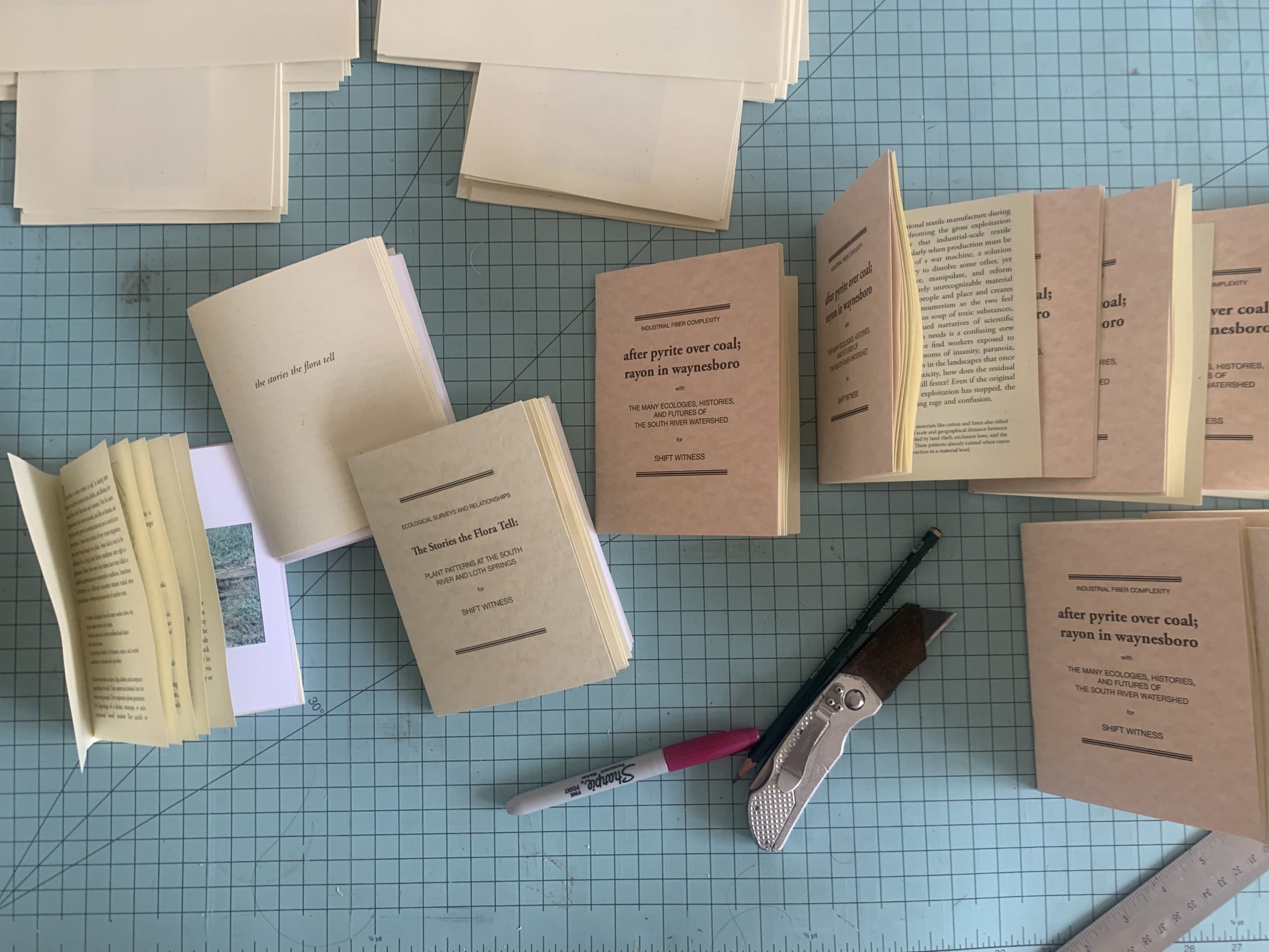 October-December 2025. Art installation, dialogue, and workshops exploring relationships with the South River. Installation was housed at Mary Baldwin University, and events took place in the gallery there as well as by the south river- including panel dialogue, plant walk, movement workshops, participatory processional/performance along the river. We also made a bundle of booklets/zines related to this work, which are still available, so reach out if interested! ///// The collaborative/collective installation and participatory events reflect an ongoing process of embodied research and ritual alongside “Loth” Spring and the South River. Our processes incorporate dance, fiber arts, sound, and other modalities. The collected images, writing, video fragments, found ephemera, textiles, ritual craft objects, and guided workshops engage with a set of questions around disturbance ecology, animate landscapes, non-linear mythology, and shifting patterns of relationships. -