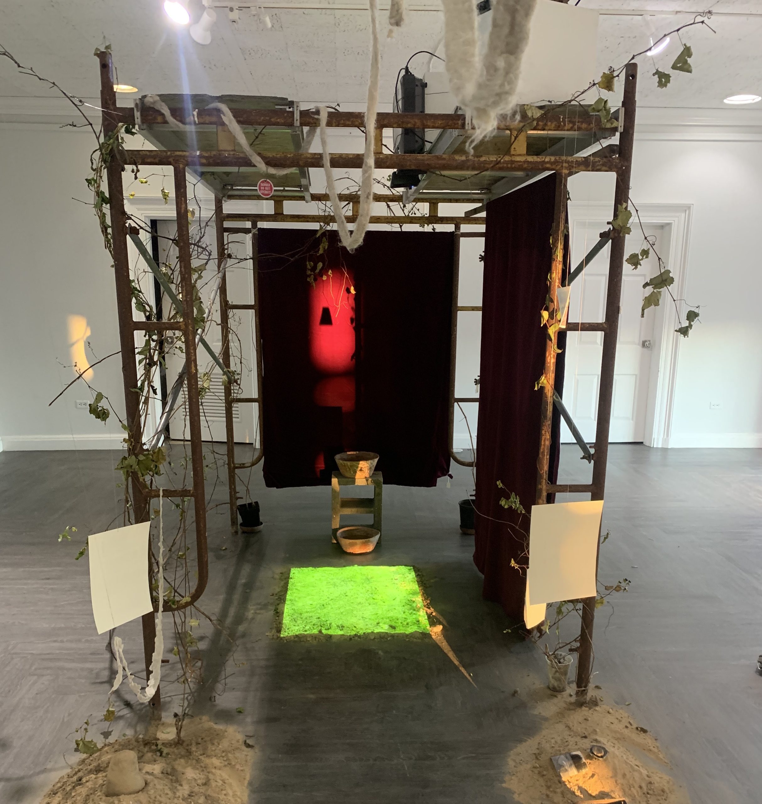 Catalyzed by Taylor Hanigosky's felted fiber and sculpture work, a group of artists/dancers/musicians collaborated to create a performance for the opening night of the gallery installation of "On Felt and Feral Grounds" in Waynesboro, VA at the Shenandoah Valley Art Center. April 2023. A video recording of this event exists for those interested. Contributors: Taylor Hanigosky, Jordan Fust, Victoria Maria Moyer, Shauna Frantz, Jenna, and Anne Hopestill Kappers "The process of wet felting wool is a modality for feeling across layered time scales of impact. The movement relationships between the body and wool embody geologic empathy where wool can act as a proxy for earthmoving processes. The body, respectively, comes into confrontation with its capacity to affect change. The action of felting works in collaboration with the intrinsic desire or function of wool: to felt. The body is pulled into a ritual where it is both the catalyst of change, and also the servant of the wool’s inherant trajectory. The Chaos of disordered fibers becomes compressed into a material of durable softness, owing its strength to the sureness of The Tangle. There is an object at the end of this elemental process—one whose utility has meant survival for humans for millennia. And there is also a relic of the forces that shape it, of the community that comes together to ruminate, to turn fodder into protein, to bend, to combust, to tangle. The felt is marked." -Taylor Hanigosky -