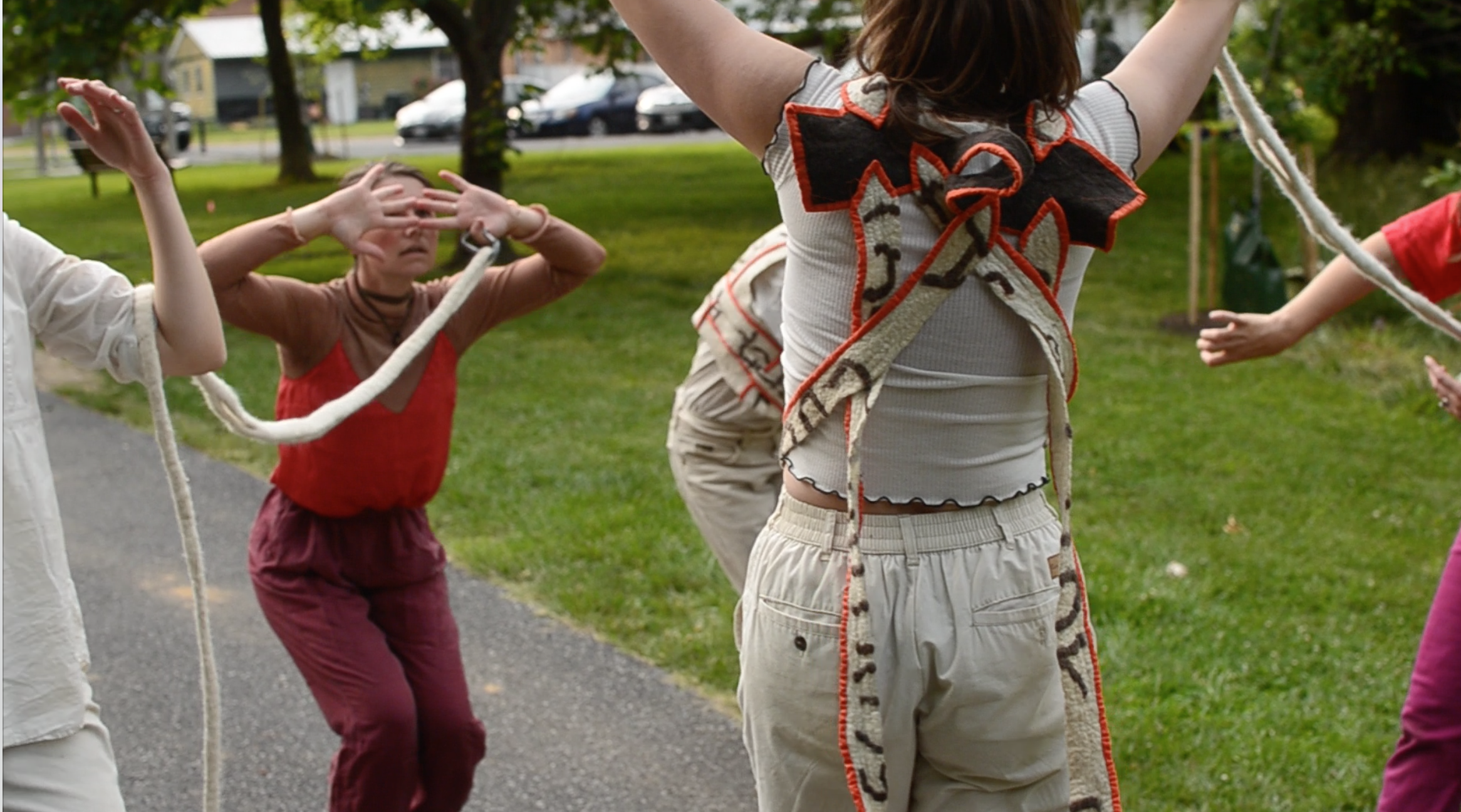 Catalyzed by Taylor Hanigosky's felted fiber and sculpture work, a group of artists/dancers/musicians collaborated to create a performance for the opening night of the gallery installation of "On Felt and Feral Grounds" in Waynesboro, VA at the Shenandoah Valley Art Center. April 2023. A video recording of this event exists for those interested. Contributors: Taylor Hanigosky, Jordan Fust, Victoria Maria Moyer, Shauna Frantz, Jenna, and Anne Hopestill Kappers "The process of wet felting wool is a modality for feeling across layered time scales of impact. The movement relationships between the body and wool embody geologic empathy where wool can act as a proxy for earthmoving processes. The body, respectively, comes into confrontation with its capacity to affect change. The action of felting works in collaboration with the intrinsic desire or function of wool: to felt. The body is pulled into a ritual where it is both the catalyst of change, and also the servant of the wool’s inherant trajectory. The Chaos of disordered fibers becomes compressed into a material of durable softness, owing its strength to the sureness of The Tangle. There is an object at the end of this elemental process—one whose utility has meant survival for humans for millennia. And there is also a relic of the forces that shape it, of the community that comes together to ruminate, to turn fodder into protein, to bend, to combust, to tangle. The felt is marked." -Taylor Hanigosky -